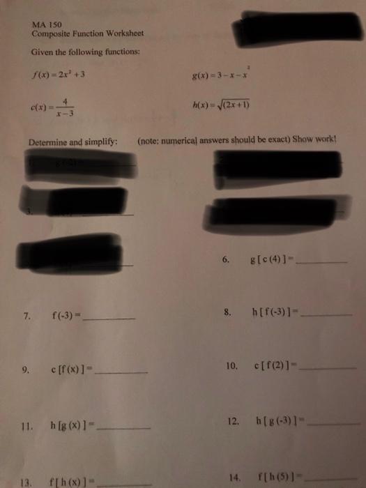 Solved Composite Function Worksheet Date Given The Follow Chegg Com from media.cheggcdn.com Uses worked examples to demonstrate how to compose functions formulaically; Grab our composition of functions worksheets and learn to compose two functions, three functions, evaluate, and decompose functions and more. They are also referred to as compound functions. The function must work for all values we give it, so it is up to us to make sure we get the domain correct! • write function rules for composite functions (lt 3). (1) using the functions f and g given below, find f o g and g o f. Work must be neat and answer must be circled. (8) consider the functions f (x), g(x), h(x) as given below.